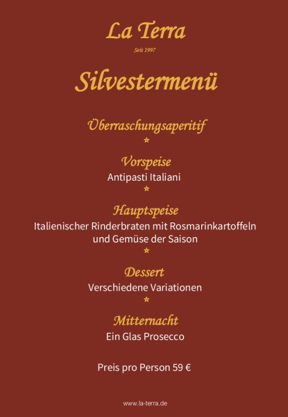 La Terra - traditionelle italienische Küche! Seit 1997 servieren wir herrliche Pasta, saftiges Fleisch, frischen Fisch, beste Steinofen-Pizza, knackigen Salat und köstliche Desserts aus frischen hochwertigen regionalen Zutaten. Innovative Kochideen, saisonale Gerichte, italienisches Ambiente - besuchen Sie uns und lassen Sie sich verwöhnen - oder bestellen Sie telefonisch Ihre Auswahl zum Mitnehmen!